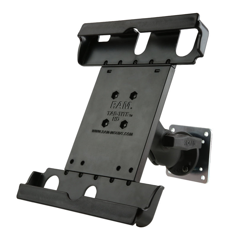 This vehicle kit includes a RAM® Tab-Tite™ spring-loaded holder for 9"-10.5" tablets with a sleeve, medium dual socket C-arm, two 2.5" diameter round bases that incorporate the universal AMPS hole pattern, a 3" x 3" back plate, and mounting hardware. The holder is designed with a 1.5" diameter rubber ball and socket system with adjustment points at both ends of the dual socket arm, allowing for nearly infinite adjustability for ideal viewing angles.